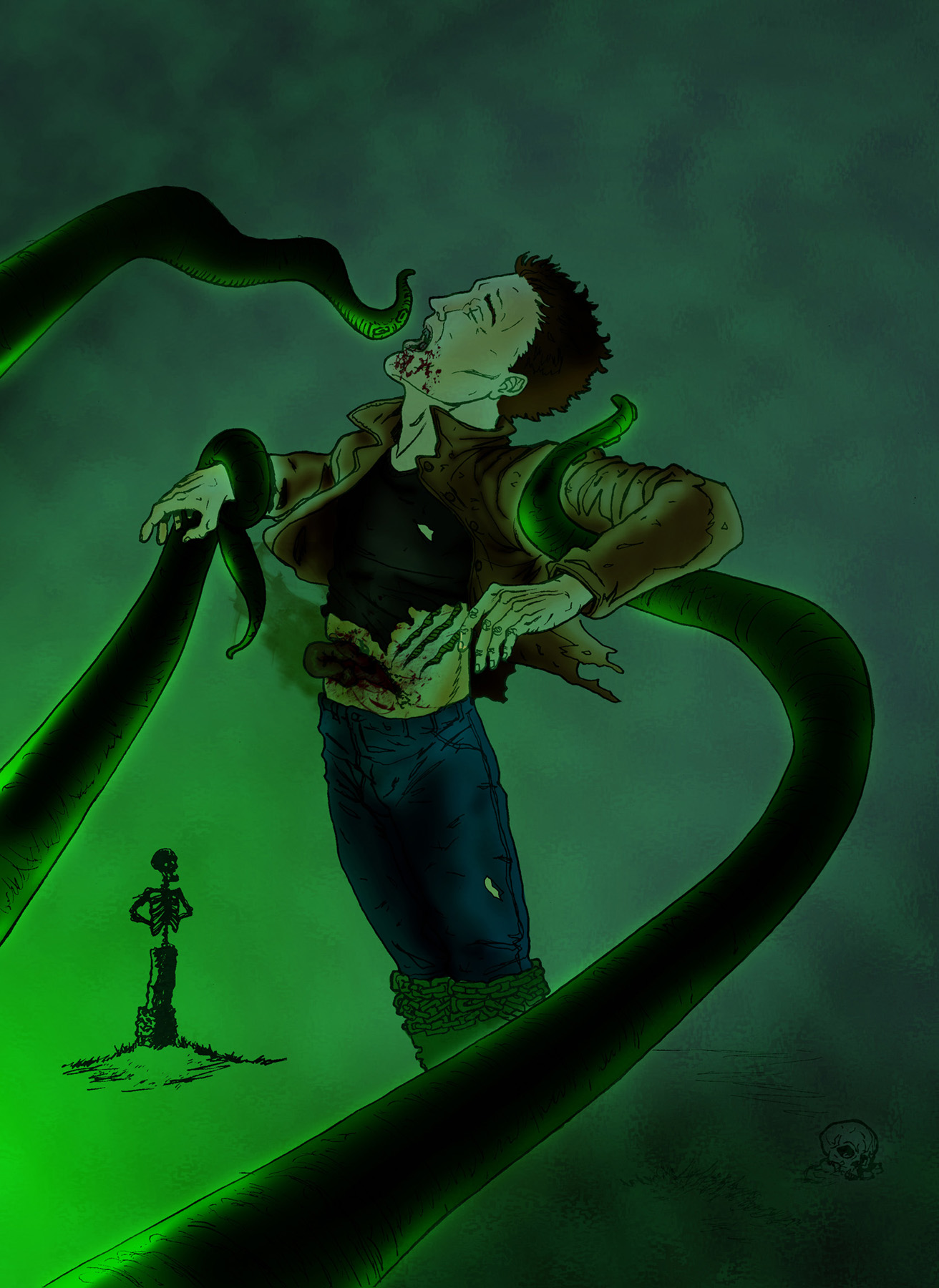 The below artwork accompanies the awesome tale “Cement Shoe Cthulhu”, written by Derek Ferreira. I started off with a simple line drawing and then coloured it in Photoshop. The before and after are below.