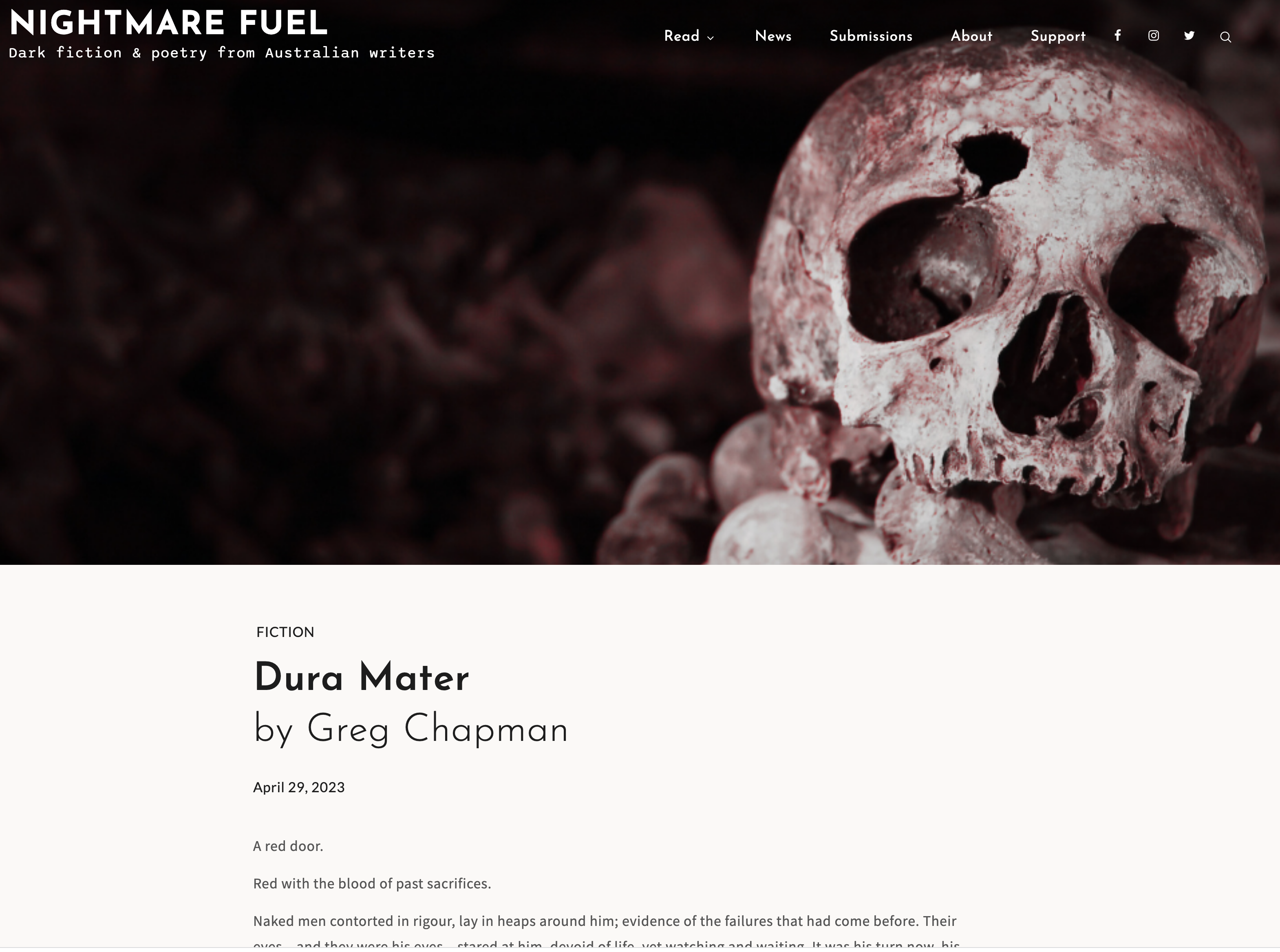 My creepy piece of flash fiction, “Dura Mater” has been published at Nightmare Fuel Magazine. Inspired by the MK Ultra mind control experiments and trephination. Check it out via the link below.