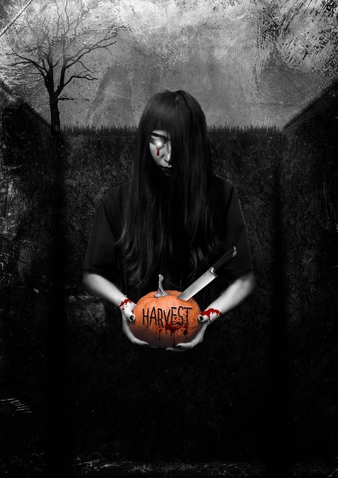 Alexandra stood over him, arms outstretched and clutching the pumpkin, which was now emblazoned with putrid rot. Yet the word HARVEST was still plain to see. Protruding from its flesh was the same kitchen knife, gleaming like firelight. Fresh blood spilled from Alexandra’s wrists and vacant eyes. Tears of pain. She spoke not a word, but her blood and that word told him everything.